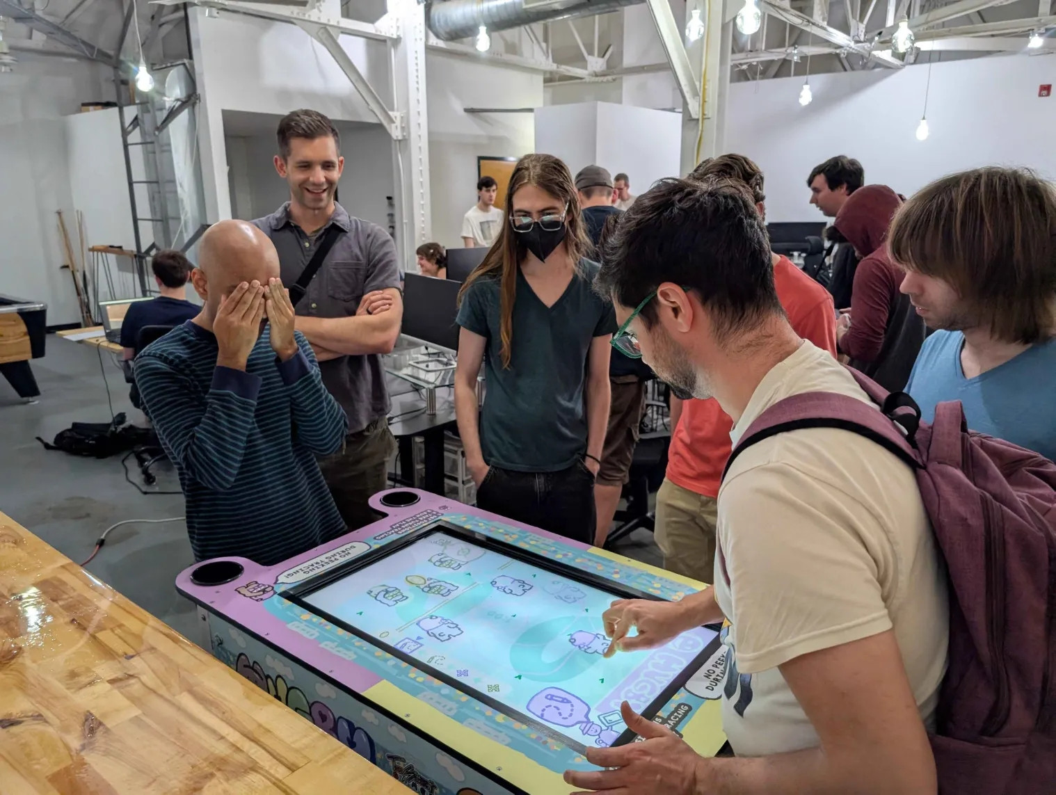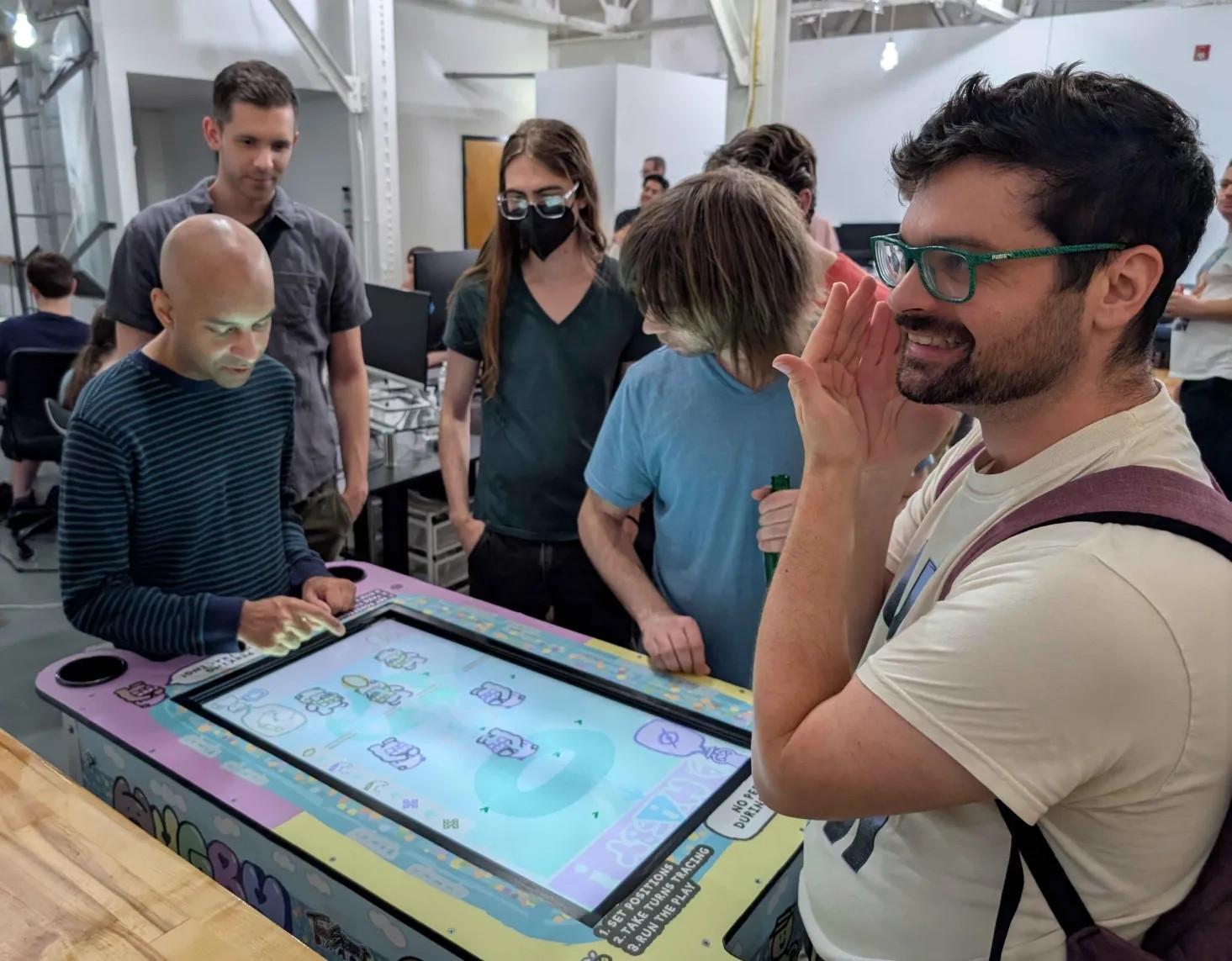 Hugby is a teddy bear football game for 2 players where you draw your own plays, presented in a magnificent, custom cocktail table arcade cabinet with a 32-inch touchscreen.